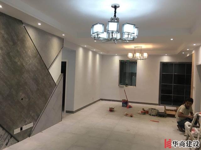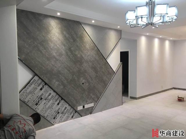 ​這是客廳裝燈結束,貼磚的都全部美縫瞭 ,背景牆瓷磚,線條黑钛金