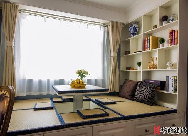 擔心牆面都是櫃子顯得壓抑的話,還可以選擇榻榻米+展示架,放一些裝飾物,書籍、花瓶、鍾表、相框、綠植等等,提升美感,讓房間更加有活力。