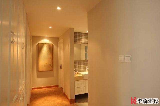 這邊的過道和客廳一樣,沒有頂燈就有小筒燈,衛生間做成三段分離,外面是洗漱台,裏面是淋浴間,設計在過道邊上用起來更方便。